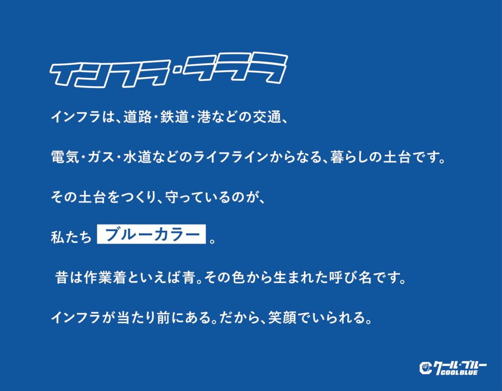 ブルーカラー職の価値を社会に正しく伝え、業界全体で必要な人材確保を目指す団体『クール・ブルー』(代表:協栄電気工業株式会社 代表取締役 石本 英成、所在地:広島県広島市)は、団体として初となるメッセージ看板『インフラ・ラララ』を、協栄電気工業の資材置き場のある長野県千曲市に設置しました。